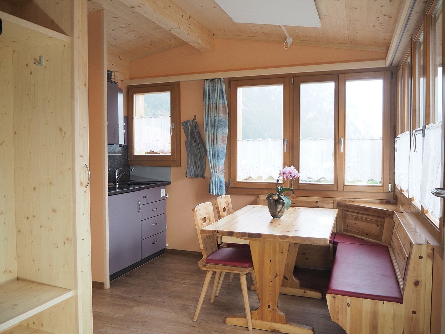 Das Chalet ist ausgestattet mit einem Schlafzimmer (2 Kajütenbetten, 4 Liegeplätze), einer liebevoll eingerichteten Kleinküche für die Selbstversorgung, kleines Bad mit Du/WC, gemütliche Sitzecke und genügen Stauraum.